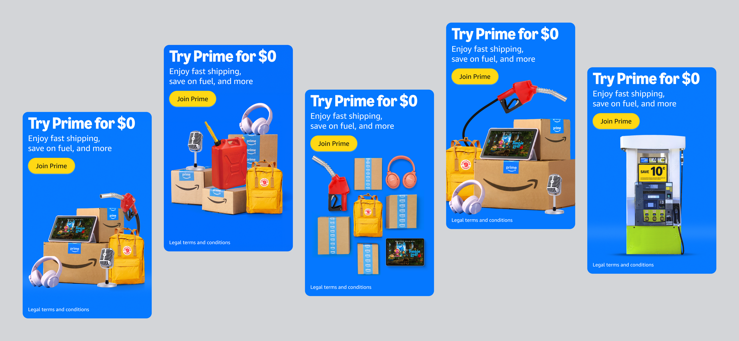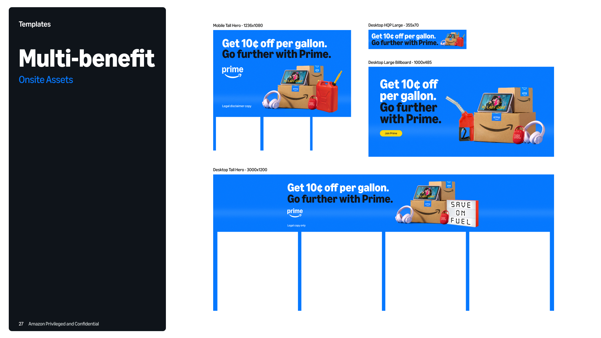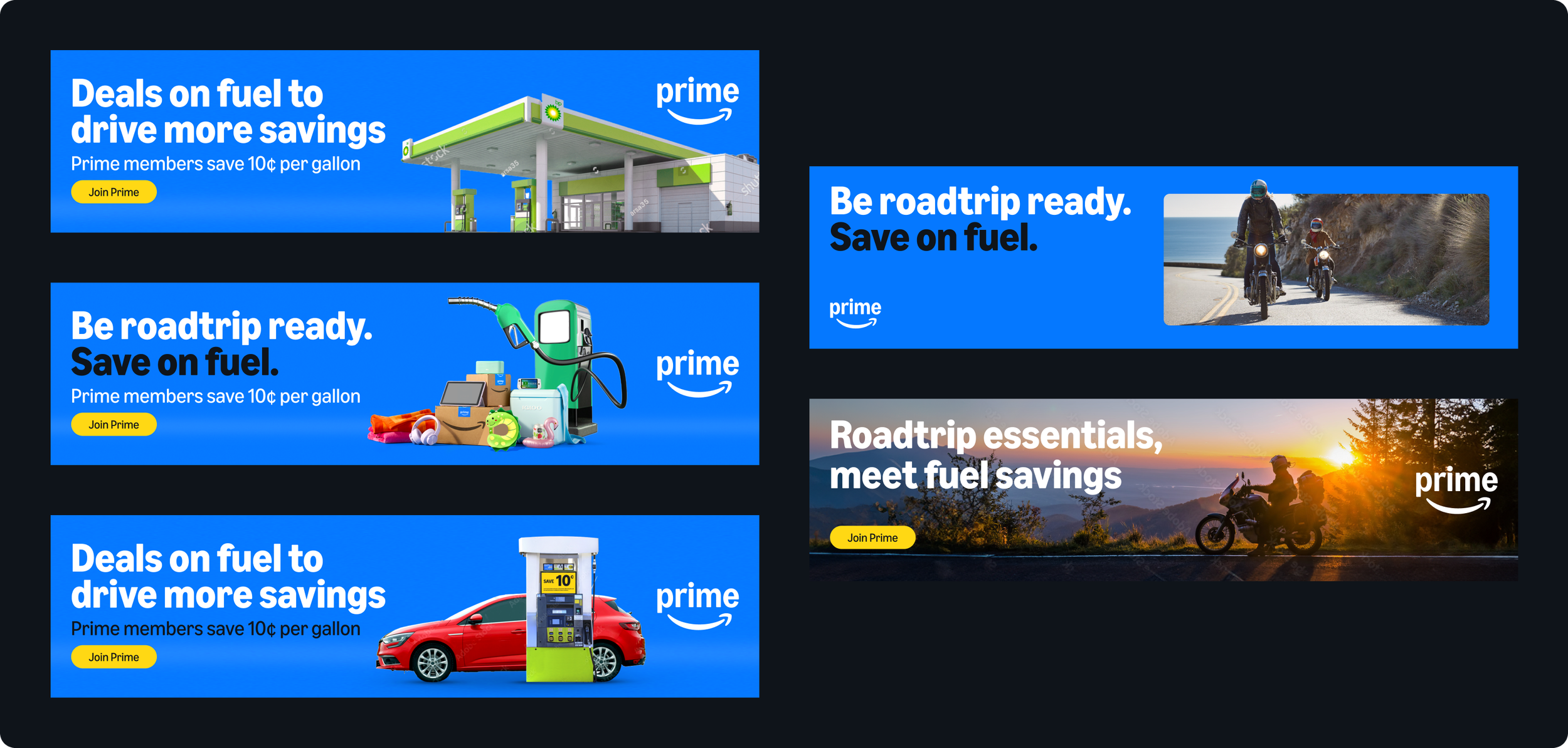 Unlike most Prime benefits that live in the digital space (like streaming or free delivery), Prime Fuel introduced a physical-world perk: saving money at the gas station. Visually and conceptually, this required a fresh approach — something distinct enough to stand out, but still recognizably “Prime.”
