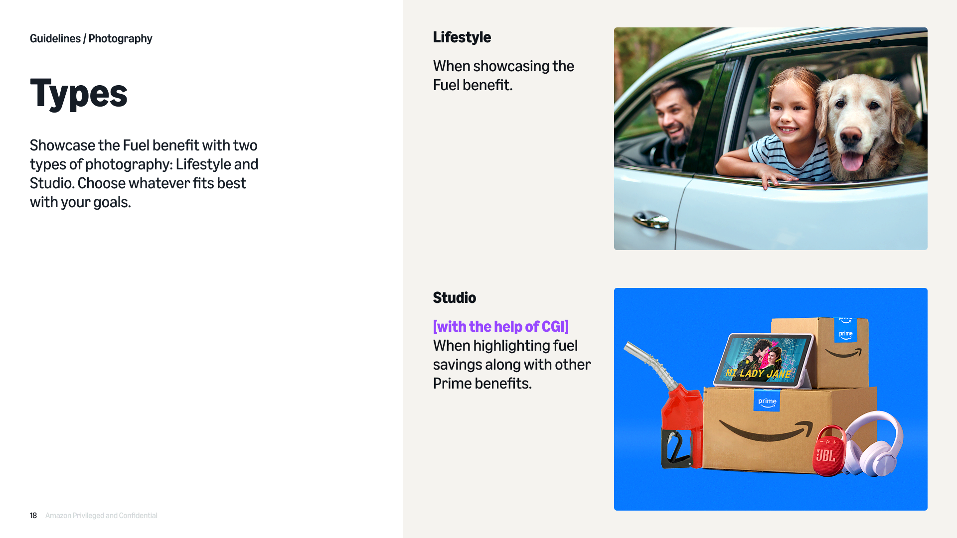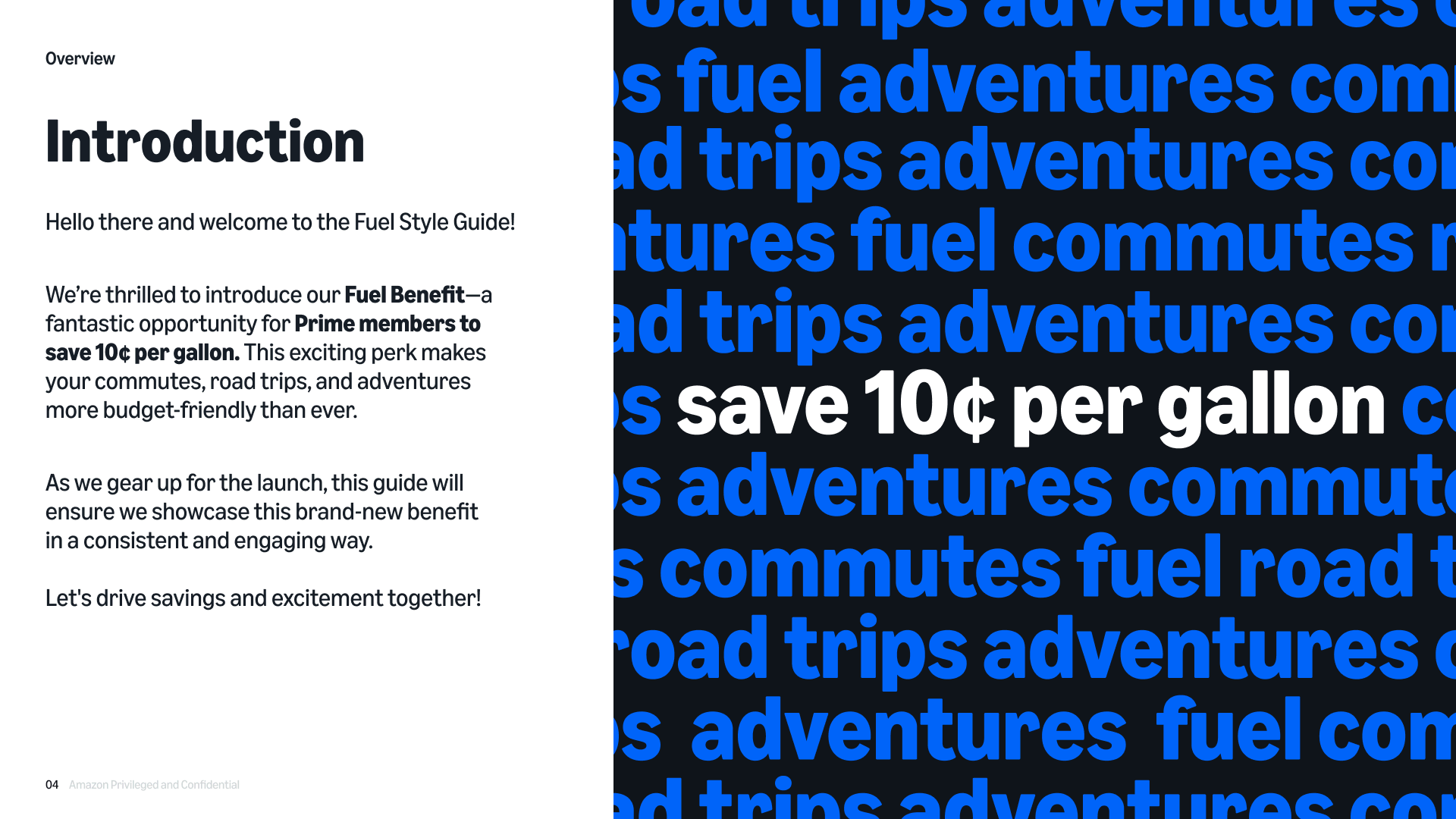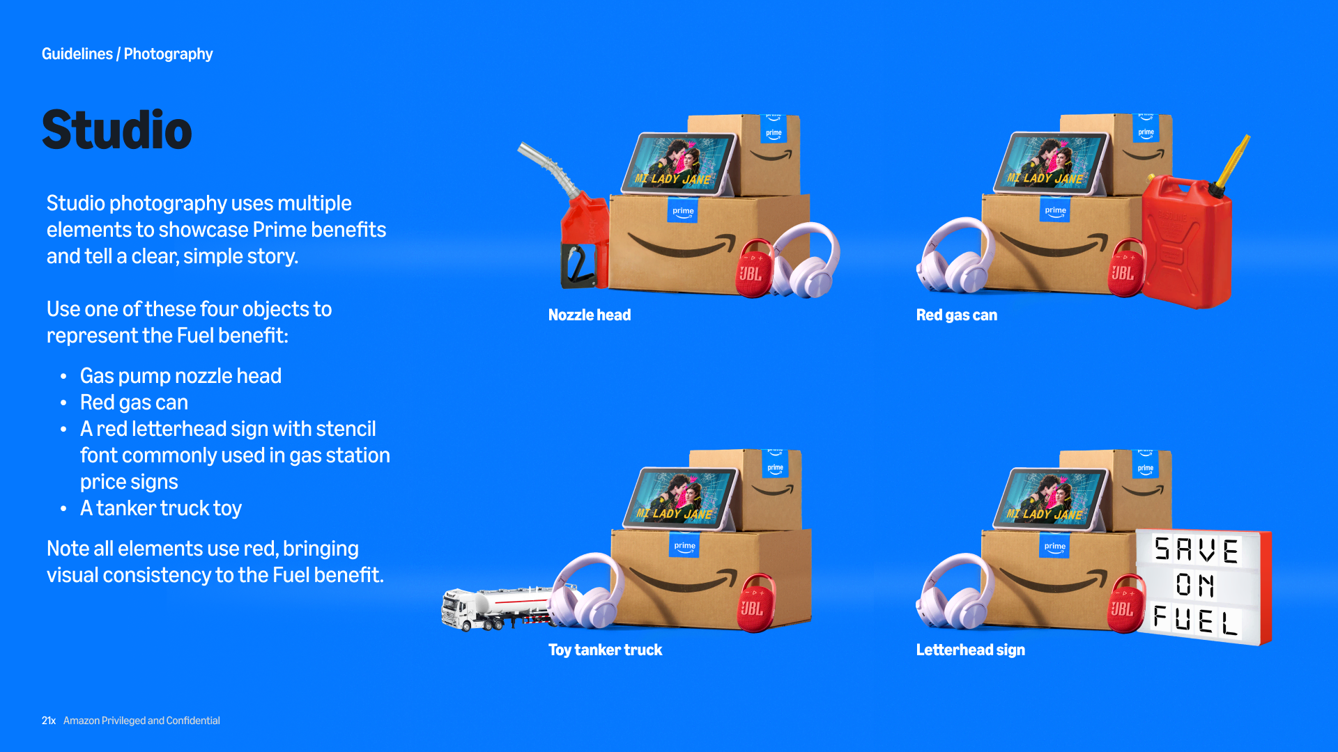 Amazon launched a new Prime member benefit offering discounts at the gas pump. The project goal was to create a strong visual and conceptual foundation that could guide future creative work while aligning with the Prime brand. The outcome was a focused style guide and visual direction that set the tone for all future messaging around this benefit — both digital and physical.