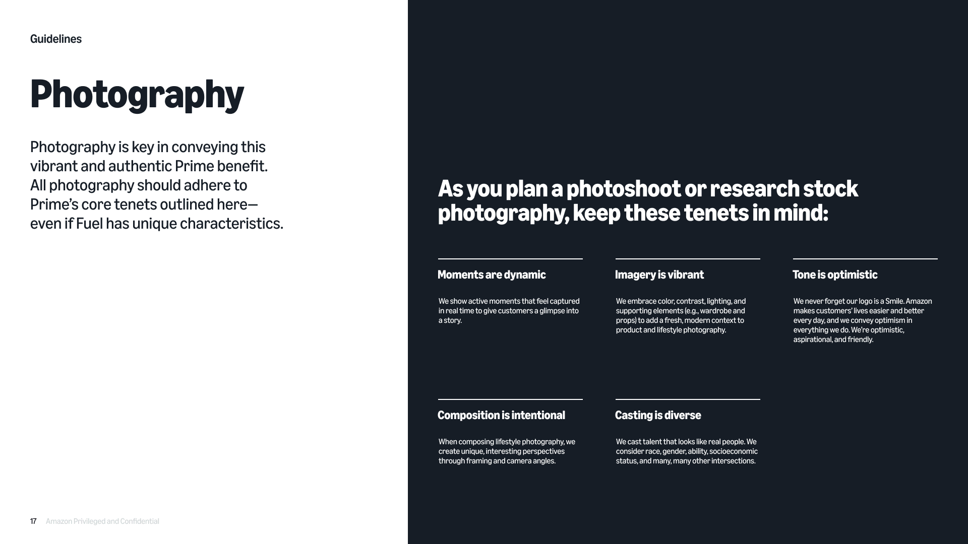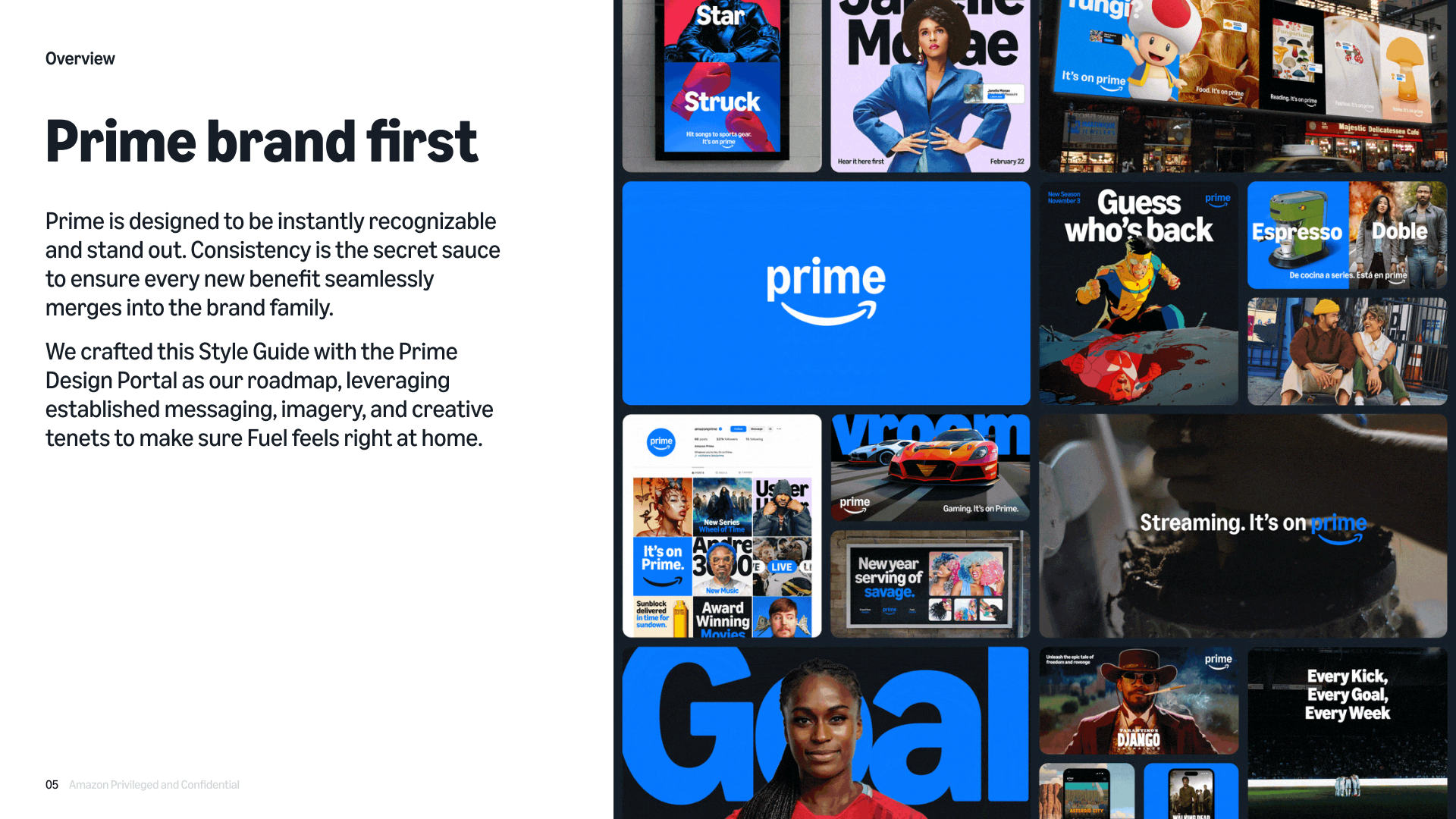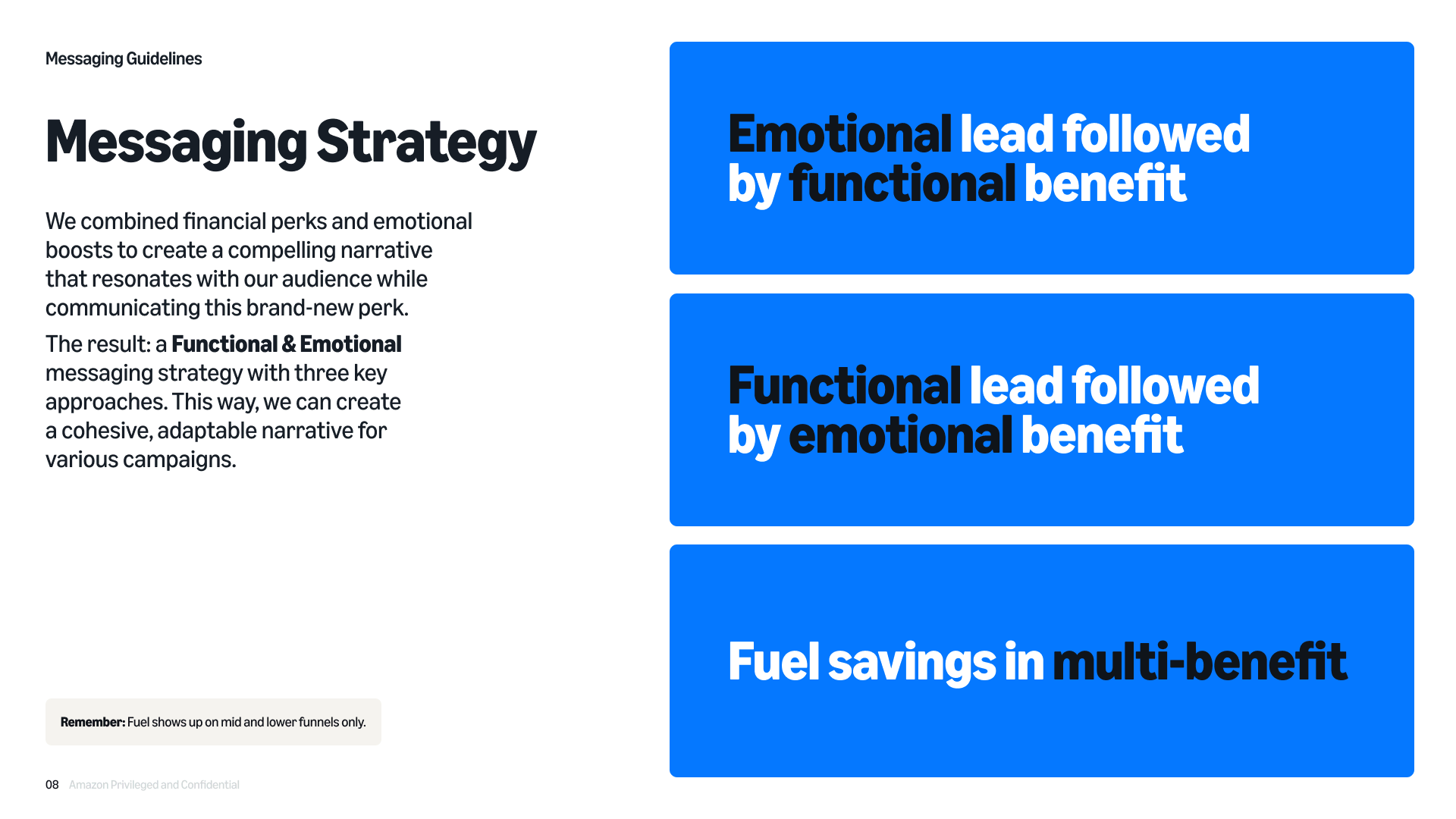 The final output was a “mini style guide”: a tight visual system for Prime Fuel that could serve as a base for creative teams across Amazon and partner agencies. It offered flexibility, clarity, and brand consistency while giving room for personalization depending on context — digital, print, or in-store.
