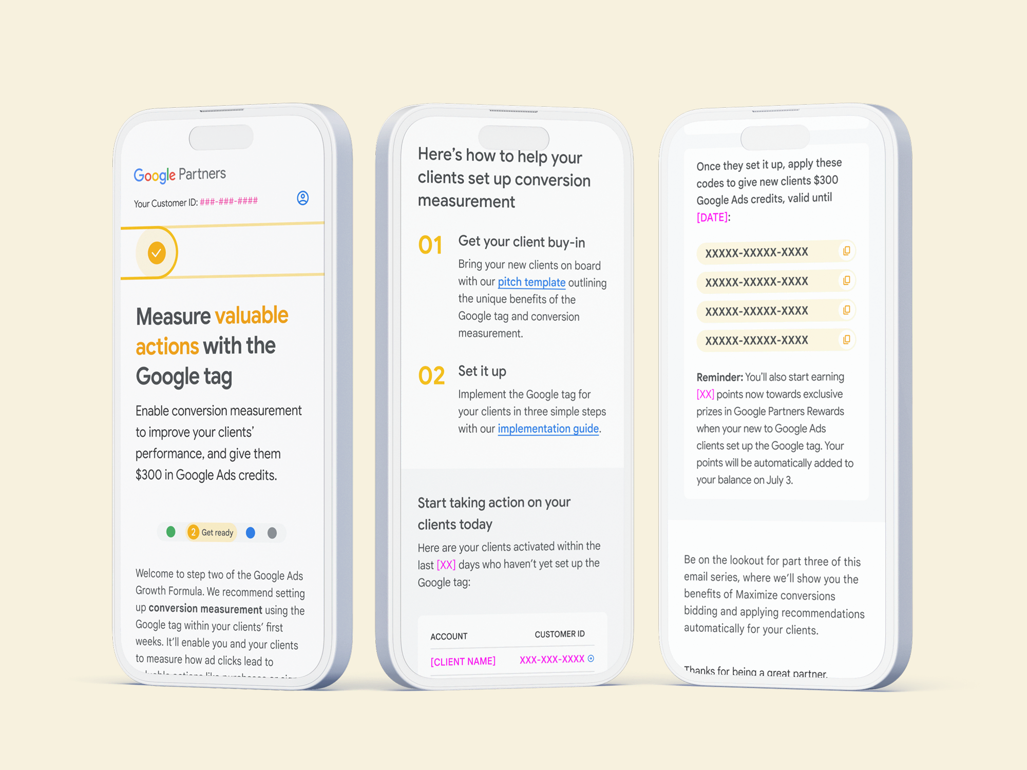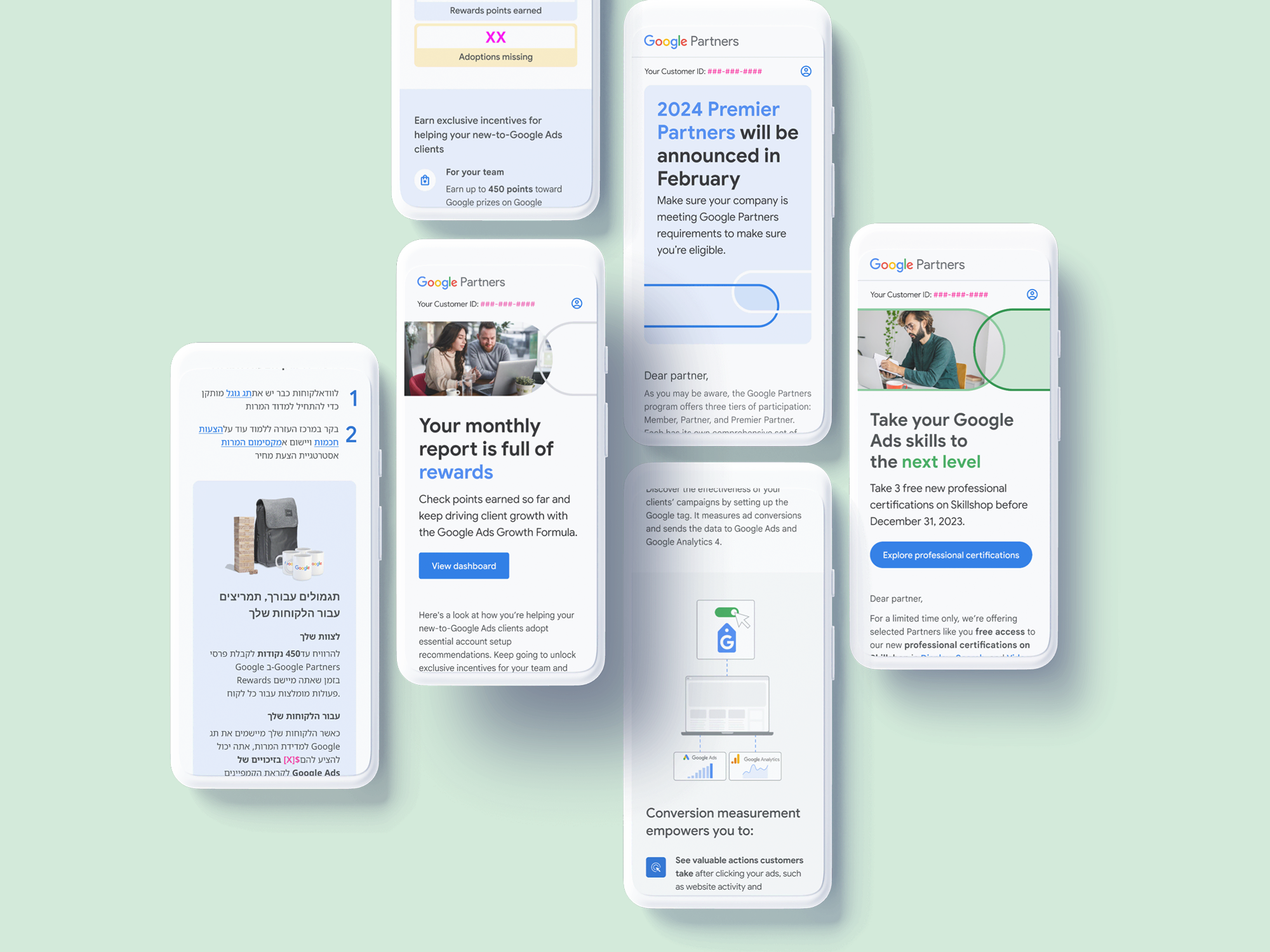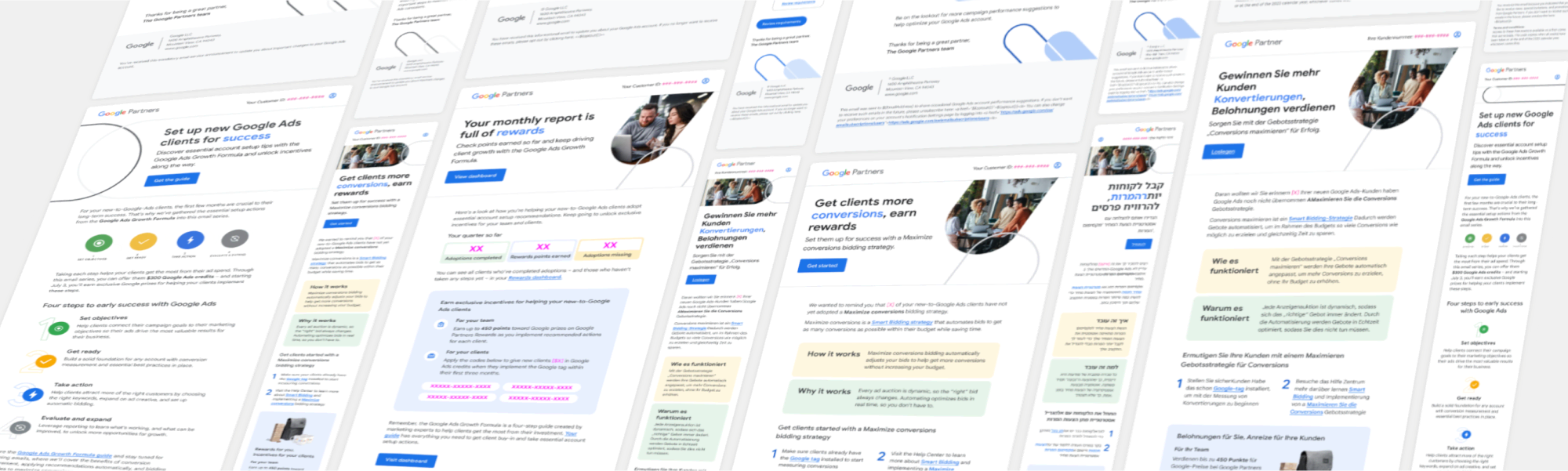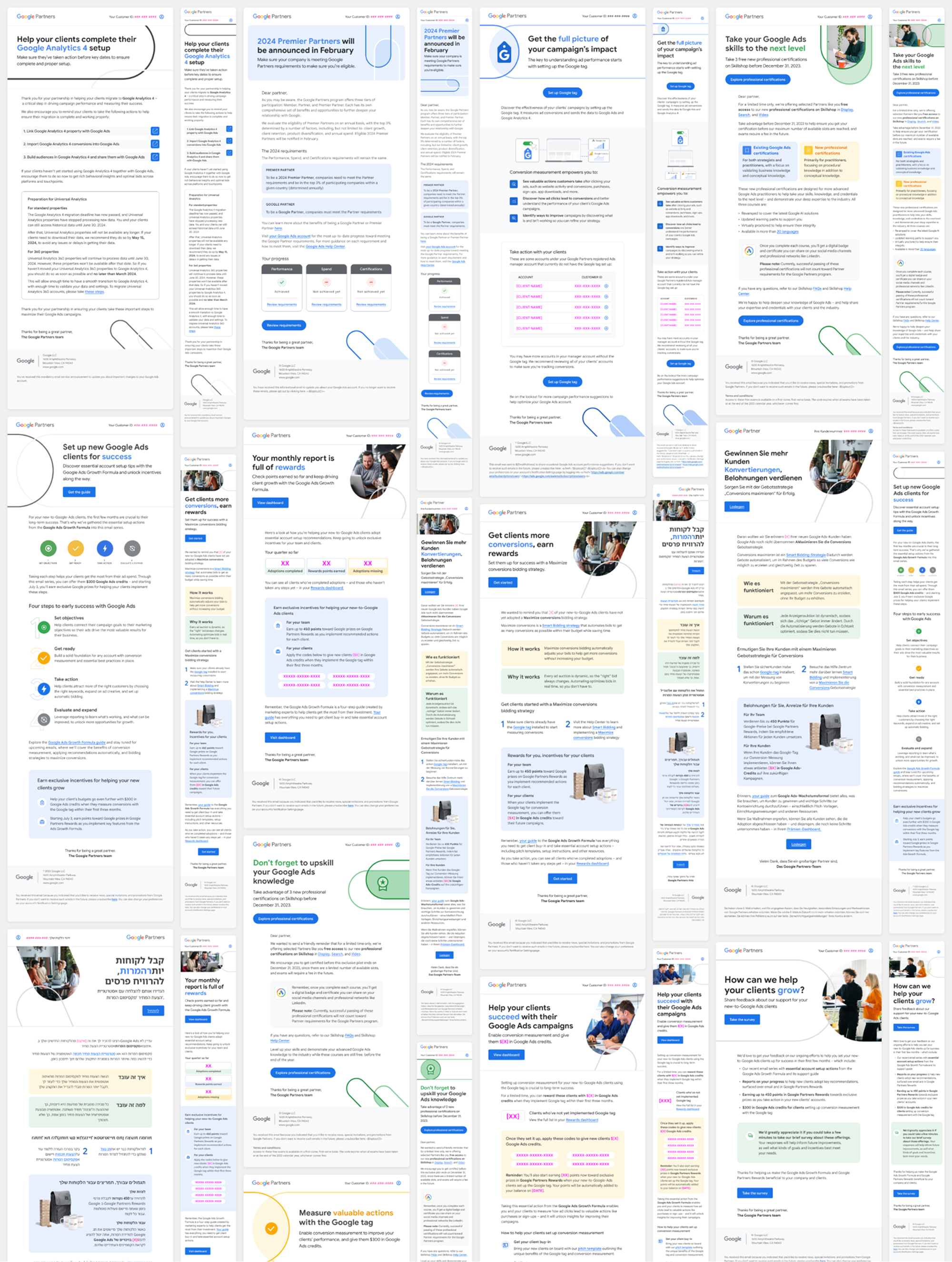 Agencies that participate in the Google Partners program manage advertising portfolios for thousands of businesses. The program itself needed to communicate with these agencies consistently through a wide variety of email campaigns, while also maintaining a cohesive brand presence across other assets.
